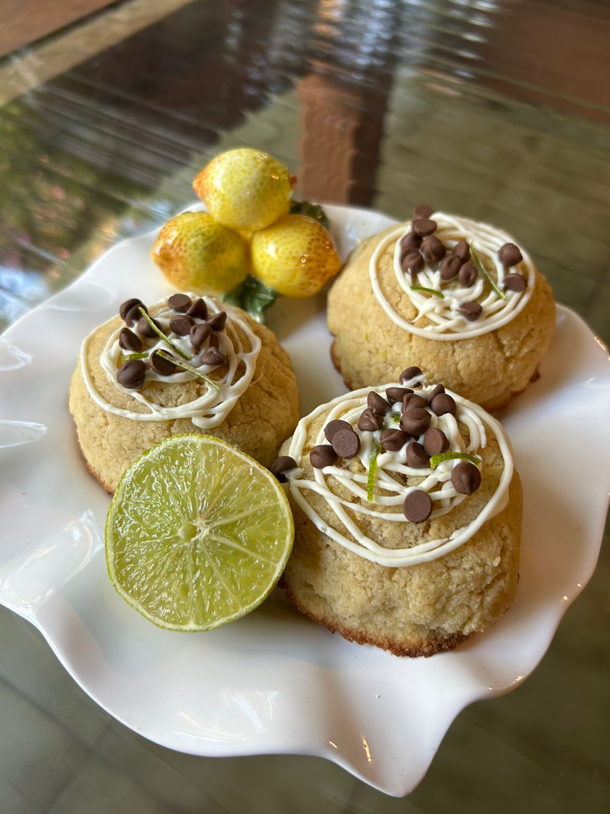 Ingredientes: Harina de almendras, stevia, chips de choco, queso crema, limón, manteca y huevo